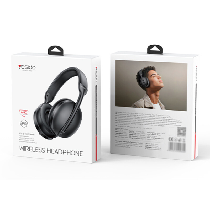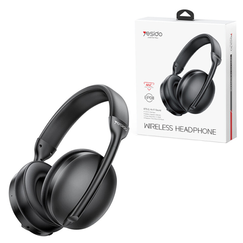 هدست بی سیم Yesido مدل EP08 .تامین انرژی از طریق باتری داخلی با ظرفیت 400 میلی آمپر ساعت .پشیبانی از فناوری ANC به منظور حذف نویز محیطی تا 20- دسی بل .میزان مدت زمان شارژدهی حدود 6 الی 8 ساعت، شارژ مجدد توسط درگاه تایپ سی و کابل همراه . دارای قابلیت تنظیم ارتفاع دسته، مجهز به درایو های 40 میلی متری با حداکثر توان خروجی 20 میلی وات .متریال بدنه ساخته شده از پلاستیک ABS، مقاوم در برابر آسیب فیزیکی های احتمالی همچون ضربه و فشار .اتصال به صورت بی سیم از طریق بلوتوث نسخه 5.3 با برد اتصال 10 متر و با سیم توسط جک 3.5 میلی متری صدا.